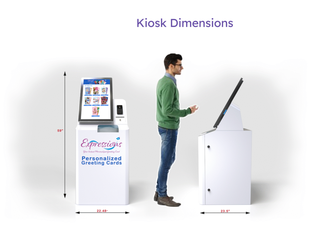 Expressions Card Kiosks designed the kiosk to be highly profitable with a fast ROI. Net margins above 70% are easily achievable due to the high capacity of the commercial FUJI printer at the heart of the kiosk. Holding 450 sheets of 120lbs card stock, the kiosk is only serviced after generating thousands of dollars in sales and then that service is performed in under 5 minutes.. by simply adding three reems of card stock into three trays of the printer and locking the kiosk. Expressions has built in all regular maintenance and toner change outs into a parallel turnkey service program paid for as cards sell, so retailers can focus elsewhere. The fact is, at even three sales per day the kiosk has a ROI under 24 months while giving retailers the ability to offer multiple products in a unique experience to their customers.