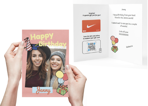 Customers can create a completely new product with their personalized greeting card (custom message and photos embedded) by then selecting to purchase an electronic gift card from hundreds of major retailers. The gift card is printed inside the greeting card and is redeemed by simply scanning a QR code and choosing either their mobile wallet (Apple or Google) or the retailer’s app. Think Starbucks. This completely new ability to integrate a greeting card and gift card now allows customers to purchase sentiment (the greeting card) and a gift (gift card) all in one transaction.